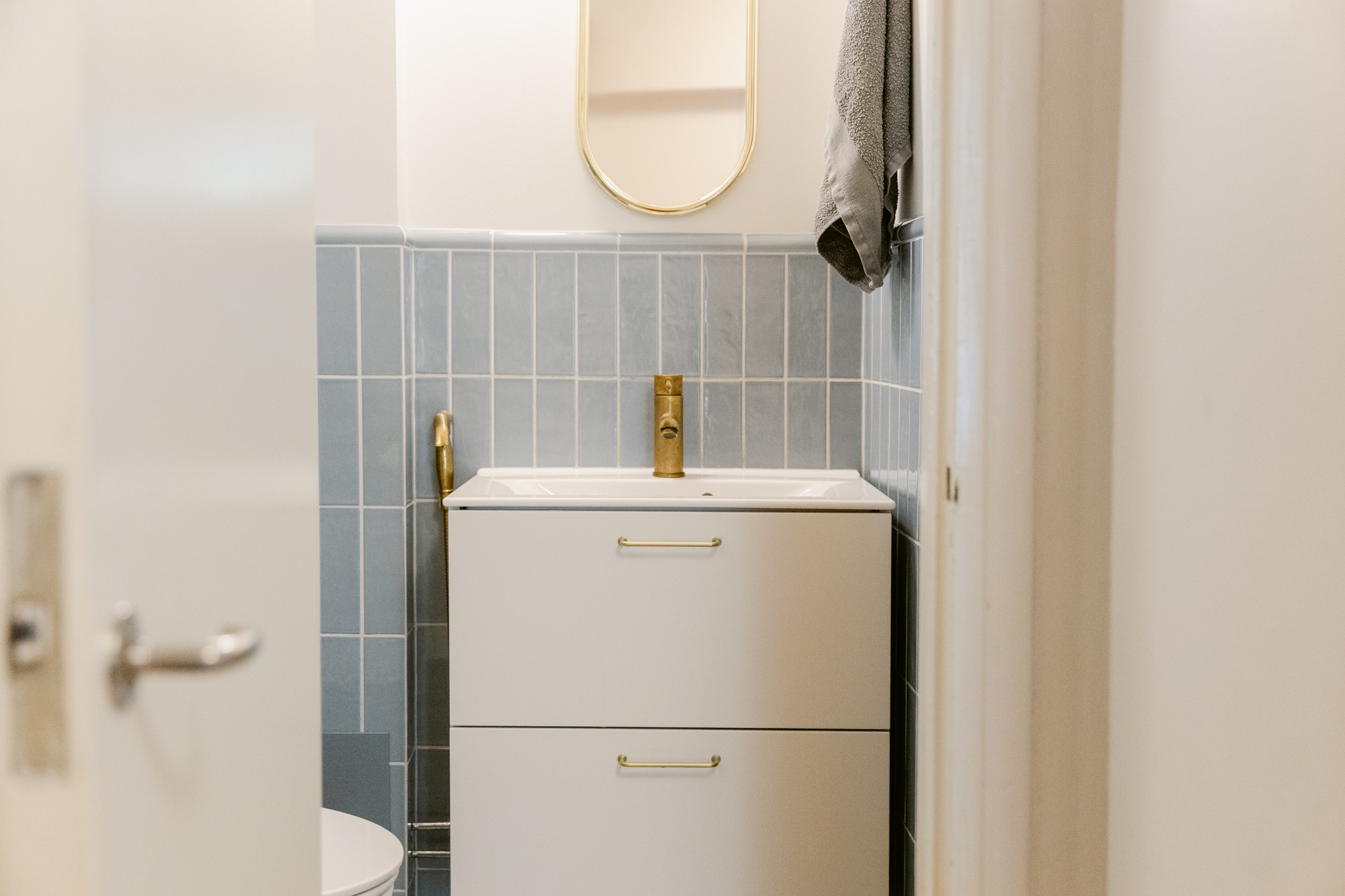 Kellarikerros oli erityisen haastava. Matala huonekorkeus, viemäröinnin ja huoneistojen välisten vesiputkien kulku kattopinnassa sekä rajalliset mahdollisuudet valaistuksen ja kalusteiden sijoittelulle vaativat luovia ratkaisuja. Yläkerran pieni wc-tila puolestaan edellytti tarkkaa mitoitusta kalustuksen ja tilankäytön osalta.